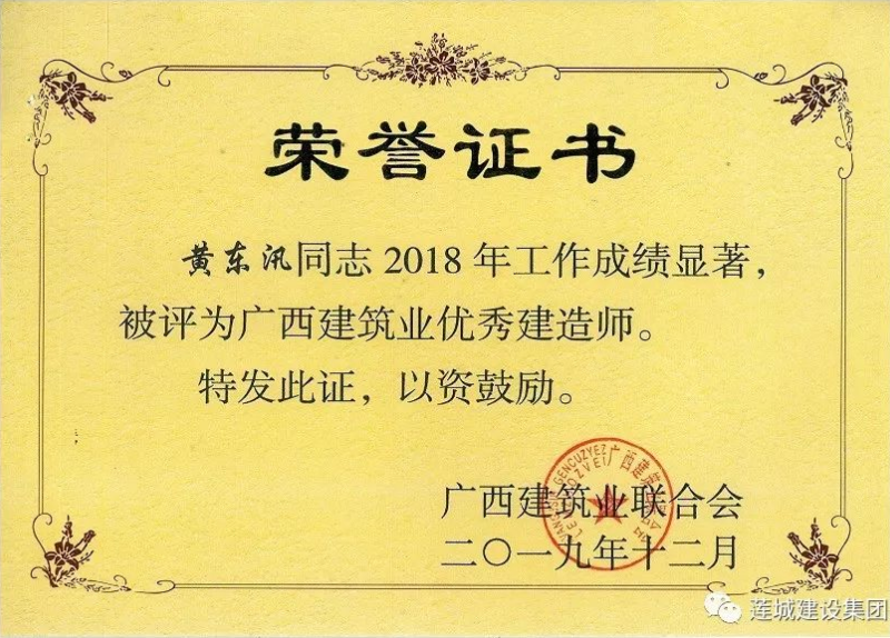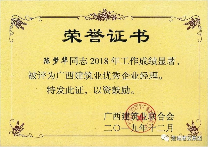 陳夢(mèng)華總經(jīng)理獲頒2018年度“廣西建筑業(yè)優(yōu)秀企業(yè)經(jīng)理”,黃東汛獲頒2018年度“廣西建筑業(yè)優(yōu)秀建造師”,黃文亮、姜紅華、譚景騰等15人獲頒2018年度“廣西建筑業(yè)安全生產(chǎn)先進(jìn)工作者”。