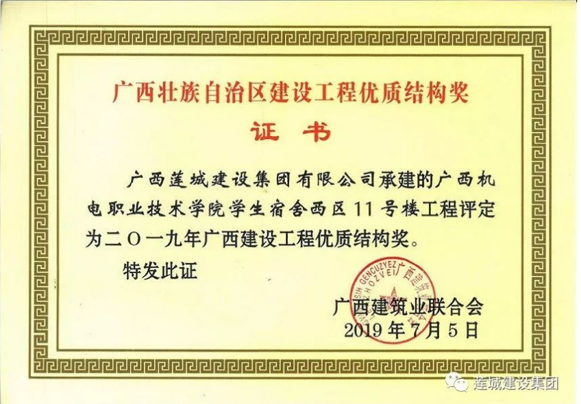 另外,公司“廣西機(jī)電職業(yè)技術(shù)學(xué)院學(xué)生宿舍西區(qū)11號(hào)樓項(xiàng)目”榮獲“2019年上半年廣西建設(shè)工程優(yōu)質(zhì)結(jié)構(gòu)獎(jiǎng)”。